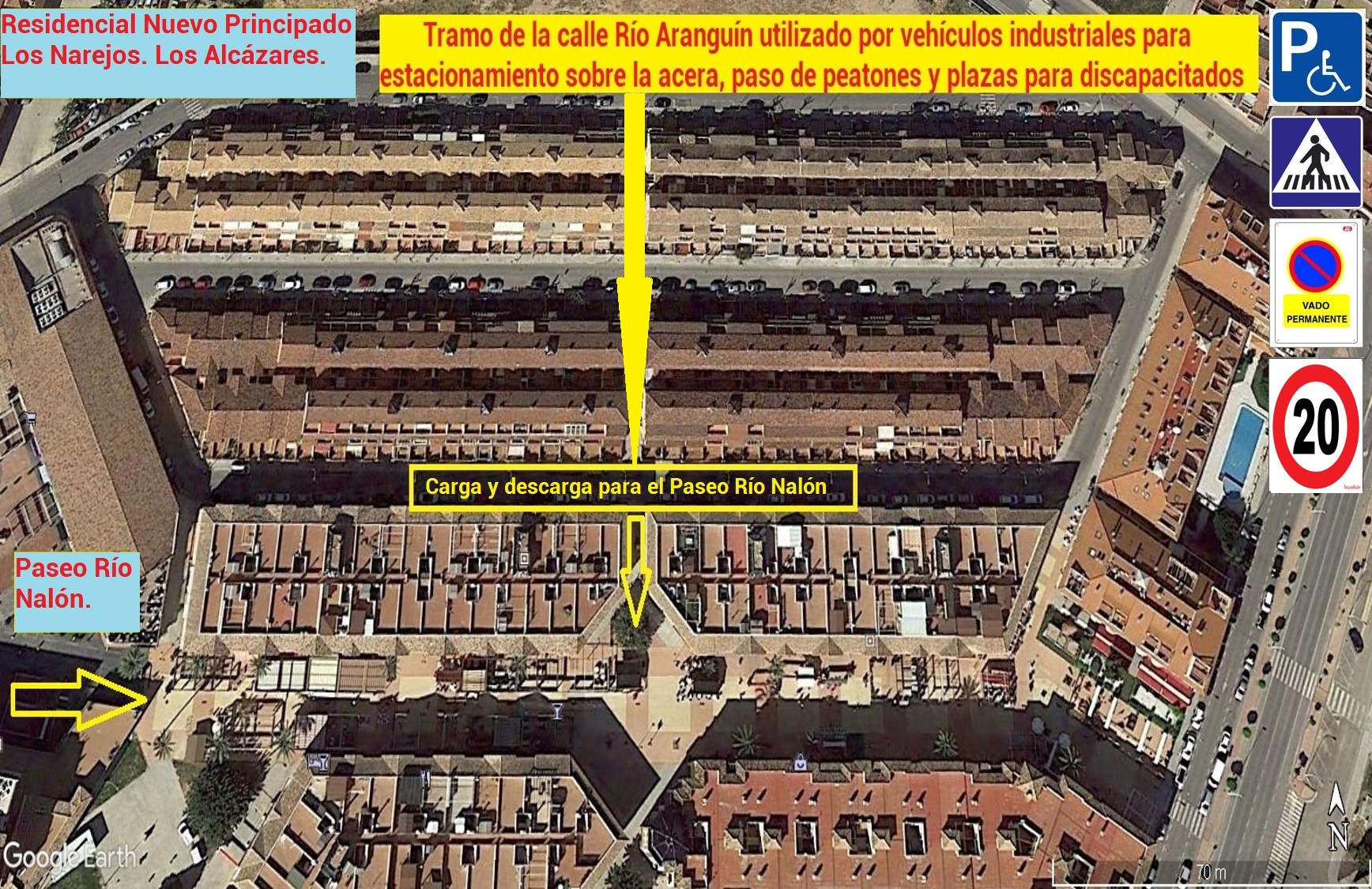 La Comunidad de Propietarios que presido se dirigió al Ayuntamiento de Los Alcázares (año 2009) solicitando una segunda plaza para personas con discapacidad en dicha calle. La respuesta fue negativa, al tiempo que señalizó un espacio de la calzada para carga y descarga de mercancías, que no existía hasta entonces y que era, y sigue siendo, causa de protestas vecinales por las molestias que produce, con presentación de Quejas ante el Defensor del Pueblo de la Región de Murcia.