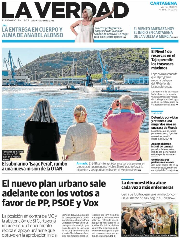 Portada del diario LA VERDAD DE CARTAGENA del día 13/02/2026