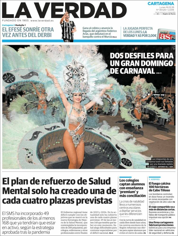 Portada del diario LA VERDAD DE CARTAGENA del día 16/02/2026