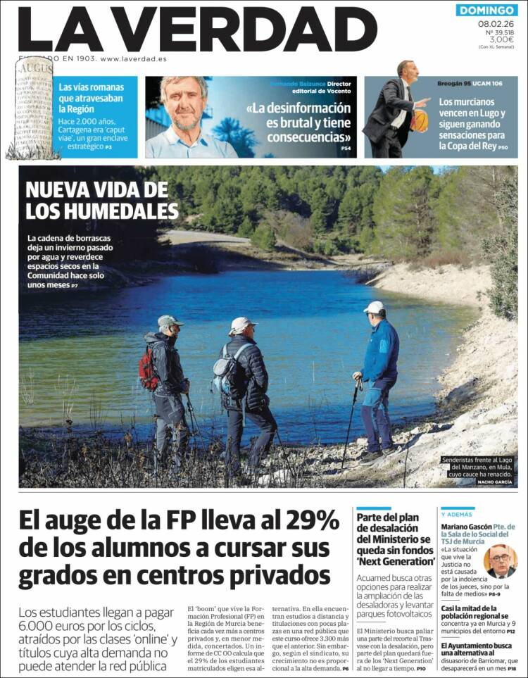 Portada del diario LA VERDAD DE MURCIA del día 8/02/2026