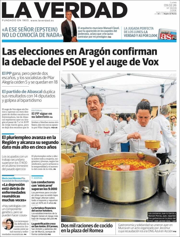 Portada del diario LA VERDAD DE MURCIA del día 9/02/2026