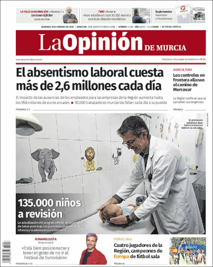 Portada del diario LA OPINIÓN DE MURCIA del día 8/02/2026