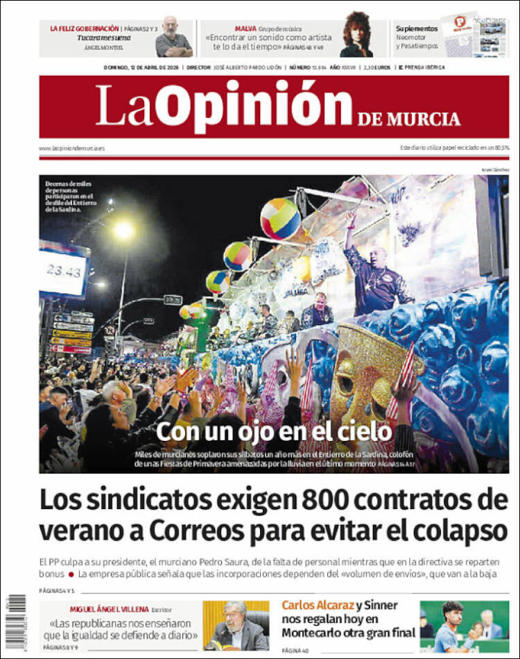 Portada del diario LA OPINIÓN DE MURCIA del día 12/04/2026