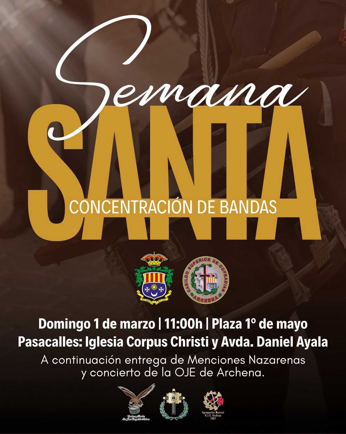 Desde las 11:00 h, disfruta de la Concentración de Bandas de Semana Santa, un encuentro que llenará nuestras calles de marchas procesionales y emoción.