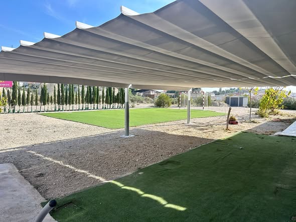 Los usuarios del Centro de Día Llano del Barco ya disfrutan de un nuevo toldo-porche instalado a la entrada del edificio. Este nuevo espacio al aire libre permitirá realizar actividades deportivas, lúdicas y de desarrollo psicomotriz en un entorno más cómodo, protegido y agradable.