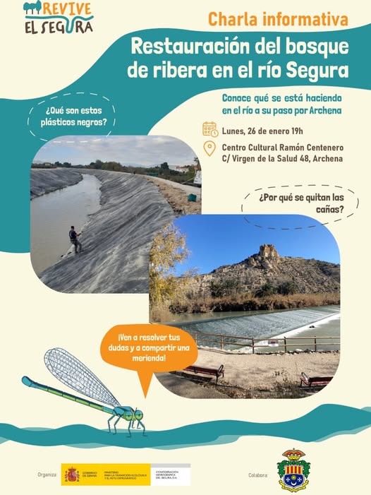 El Ayuntamiento de Archena te invita a asistir en la charla organizada por la Confederación Hidrográfica del Segura, donde se presentará el proyecto de limpieza y eliminación de cañas del cauce del río.