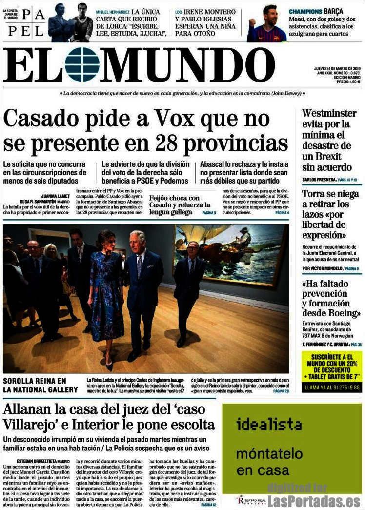 Cover of the newspaper El Mundo of the day 03/14/2019 News Europa14 marzo, 2019 Cover of the newspaper El Mundo of the day 03/14/2019