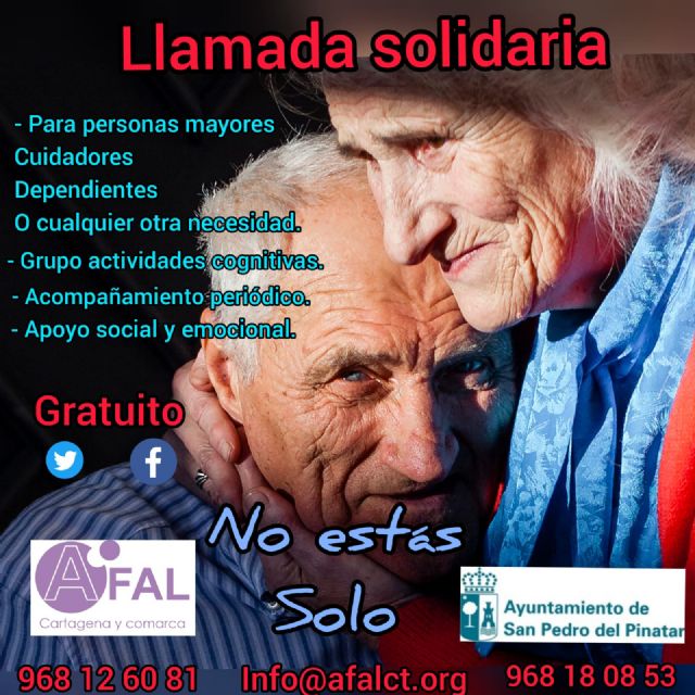 «Llamada Solidaria» está dirigido a personas mayores del municipio, cuidadores, dependientes, etc que pueden contactar a través del teléfono del Hogar del Pensionista 968 18 08 53 o el teléfono de AFAL 968 12 60 81.