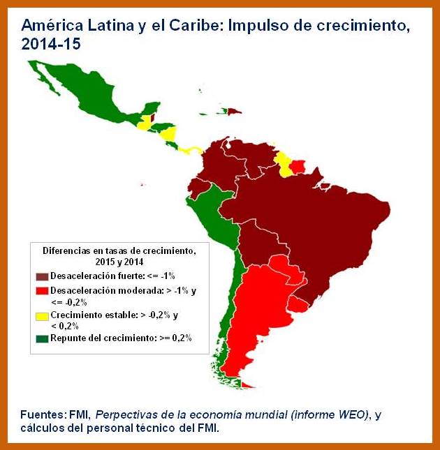 El informe de Perspectivas Económicas Globales del FMI, divulgado esta semana al inicio de la reunión de primavera del organismo en Washington, pronostica una desaceleración de Latinoamérica hasta el 0,9% en 2015, con un repunte hasta el 2 % en 2016.
