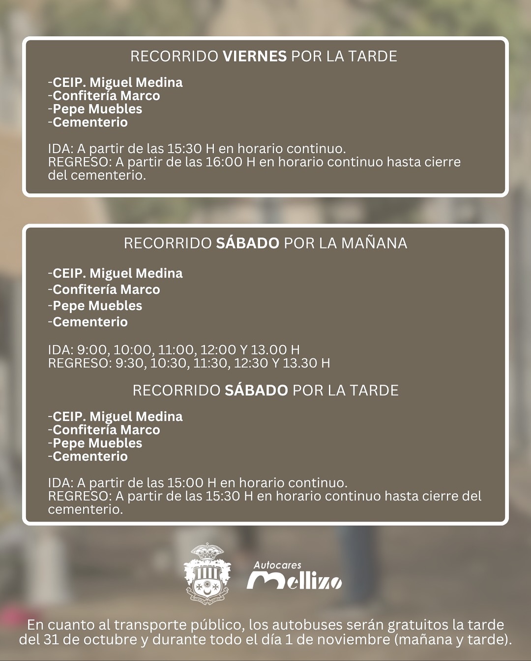 Con motivo del Día de Todos los Santos, el Ayuntamiento pone a disposición de los vecinos transporte público gratuito para facilitar las visitas al cementerio. Viernes 31 de octubre (tarde)…