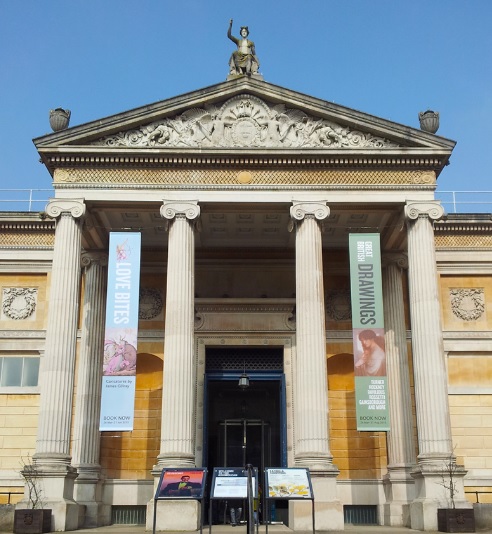 El edificio actual data de 1845. Fue diseñado por Charles Cockerell en un estilo clásico y está en Beaumont Street. Un ala del edificio está ocupada por la Institución Taylor, la facultad de lenguas modernas de la universidad. El museo principal contiene las colecciones originales de Elias Ashmole y John Tradescant (padre e hijo), así como amplias colecciones de arqueología y bellas muestras de arte. Cuenta con una de las mejores colecciones de pinturas Prerrafaelitas, piezas de cerámica mayólica y plata inglesa. El departamento de arqueología incluye el legado de Arthur Evans y también posee una excelente colección de cerámica griega y minoica. El departamento tiene una extensa colección de objetos del Antiguo Egipto y Sudán; el museo también alberga el Instituto Griffith, para el estudio de egiptología.
