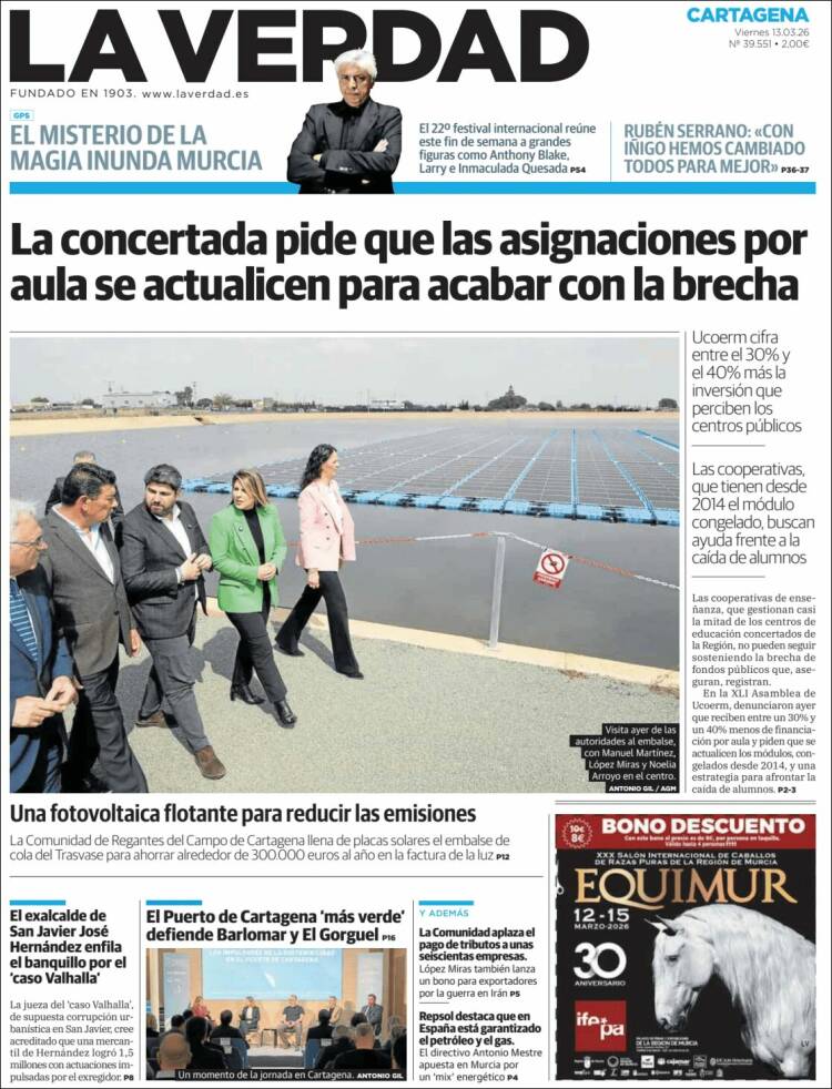 Portada del diario LA VERDAD DE CARTAGENA del día 13/03/2026