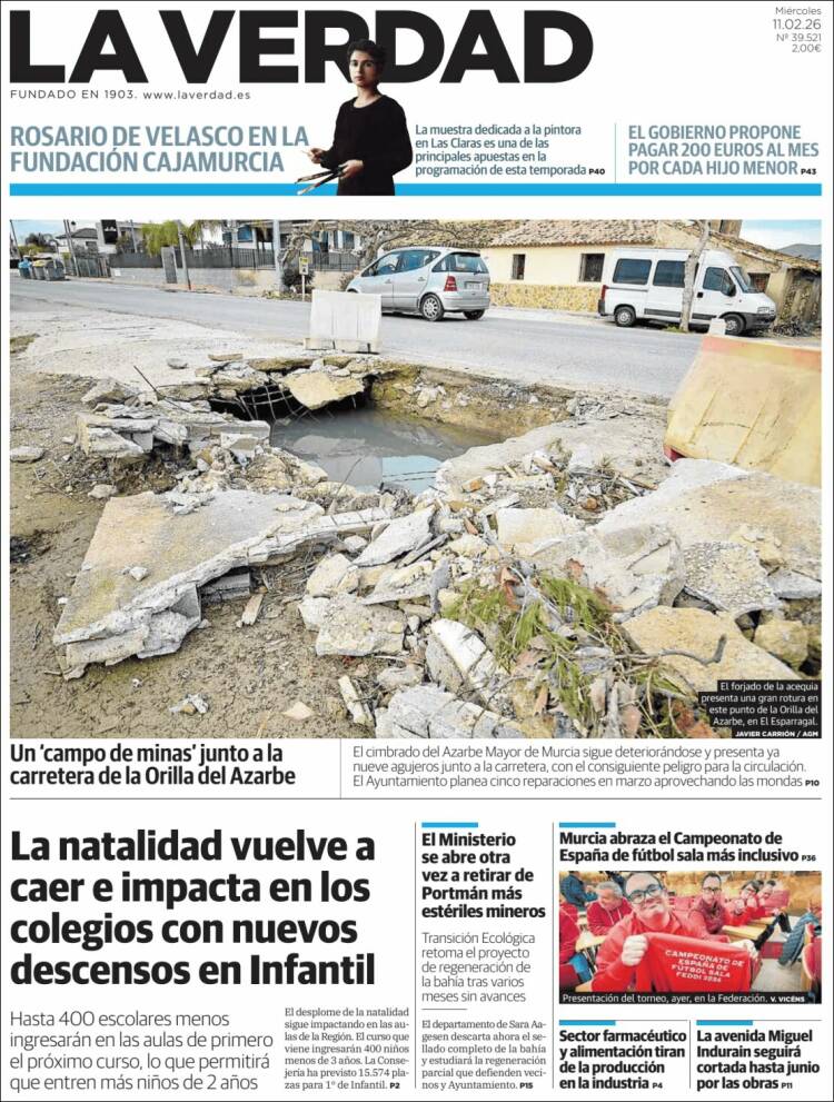 Portada del diario LA VERDAD DE MURCIA del día 11/02/2026