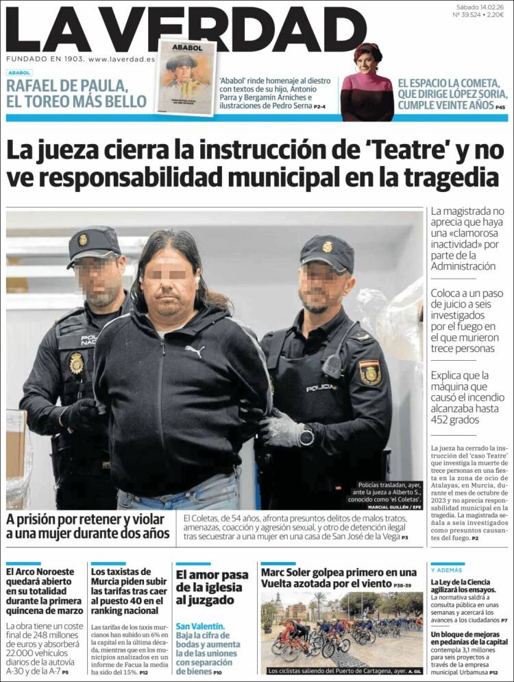 Portada del diario LA VERDAD del día 14/02/2026