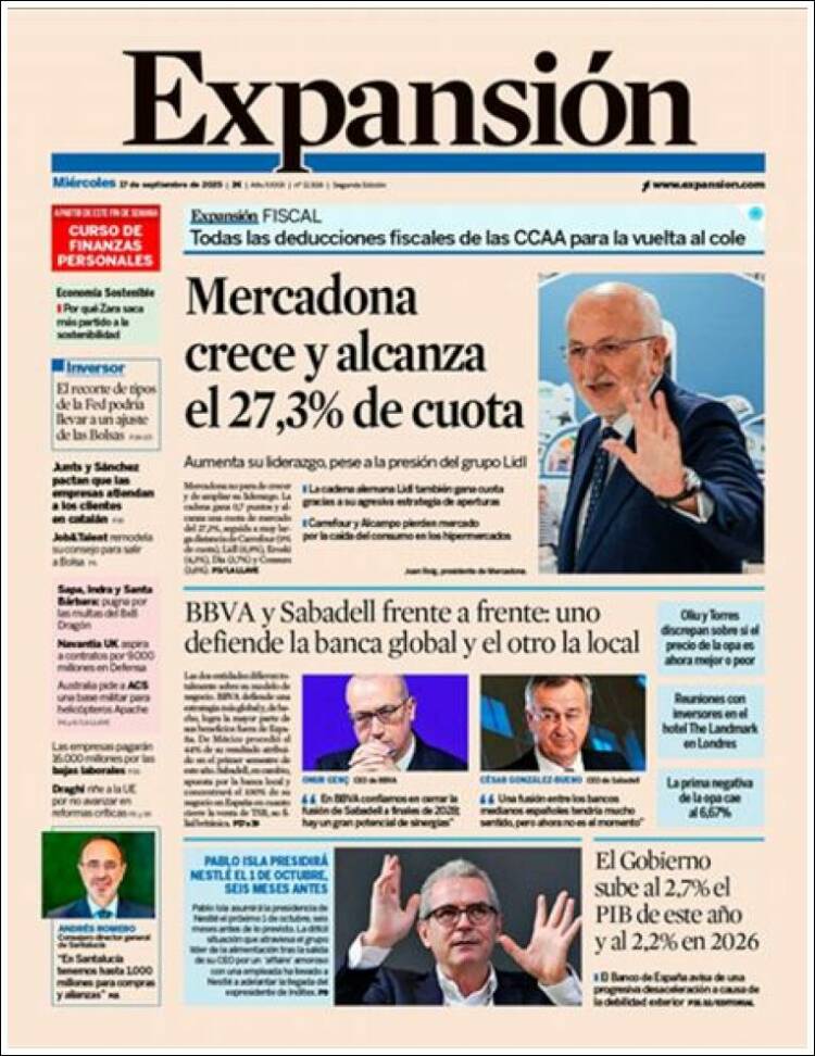Portada del diario EXPANSIÓN del día 27/09/2025