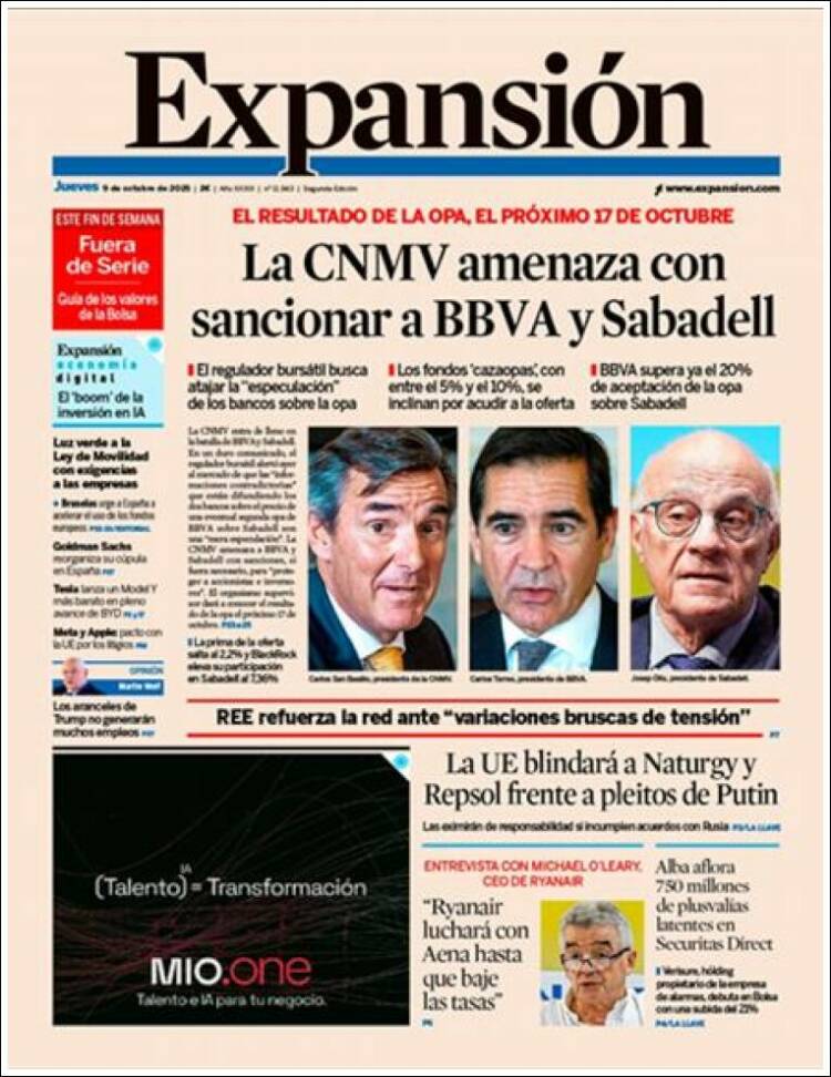 Portada del diario EXPANSIÓN del día 9/10/2025