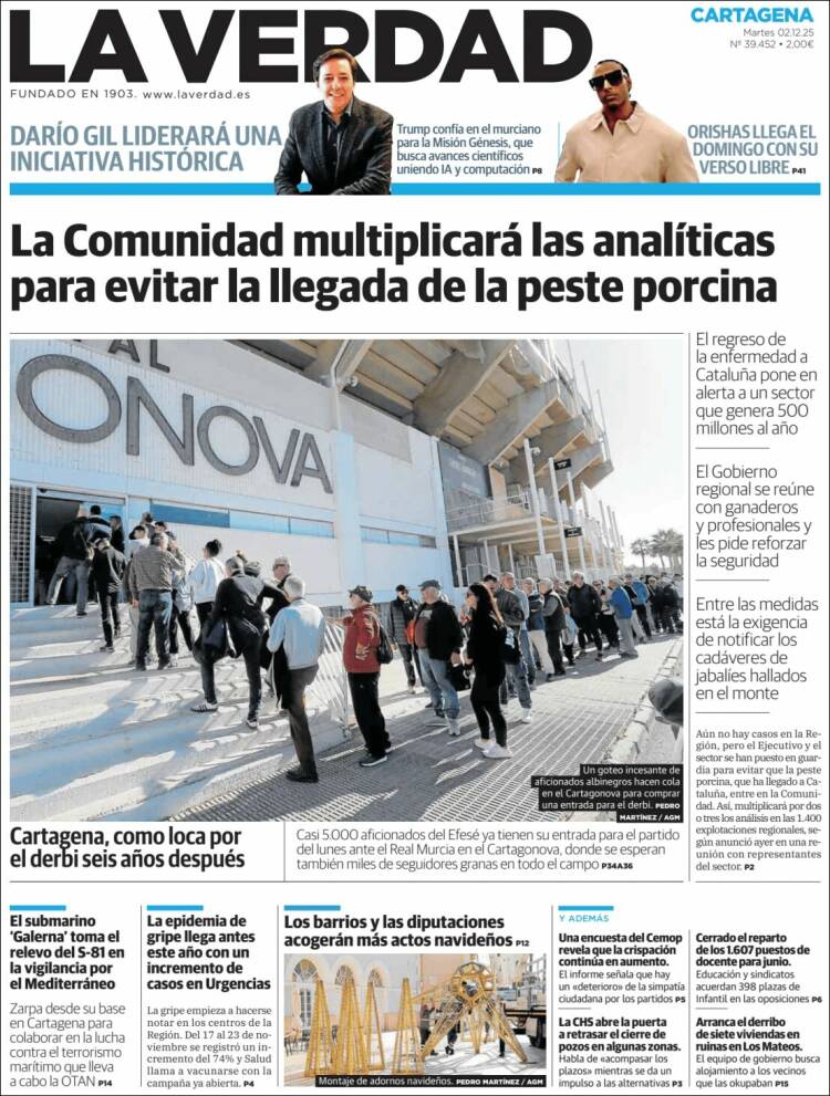 Portada del diario LA VERDAD DE CARTAGENA del día 2/12/2025